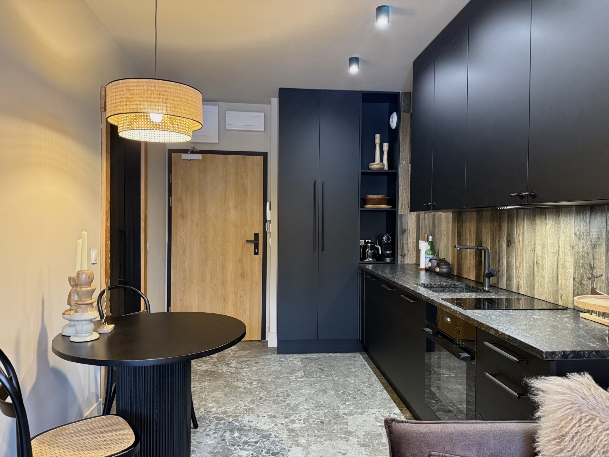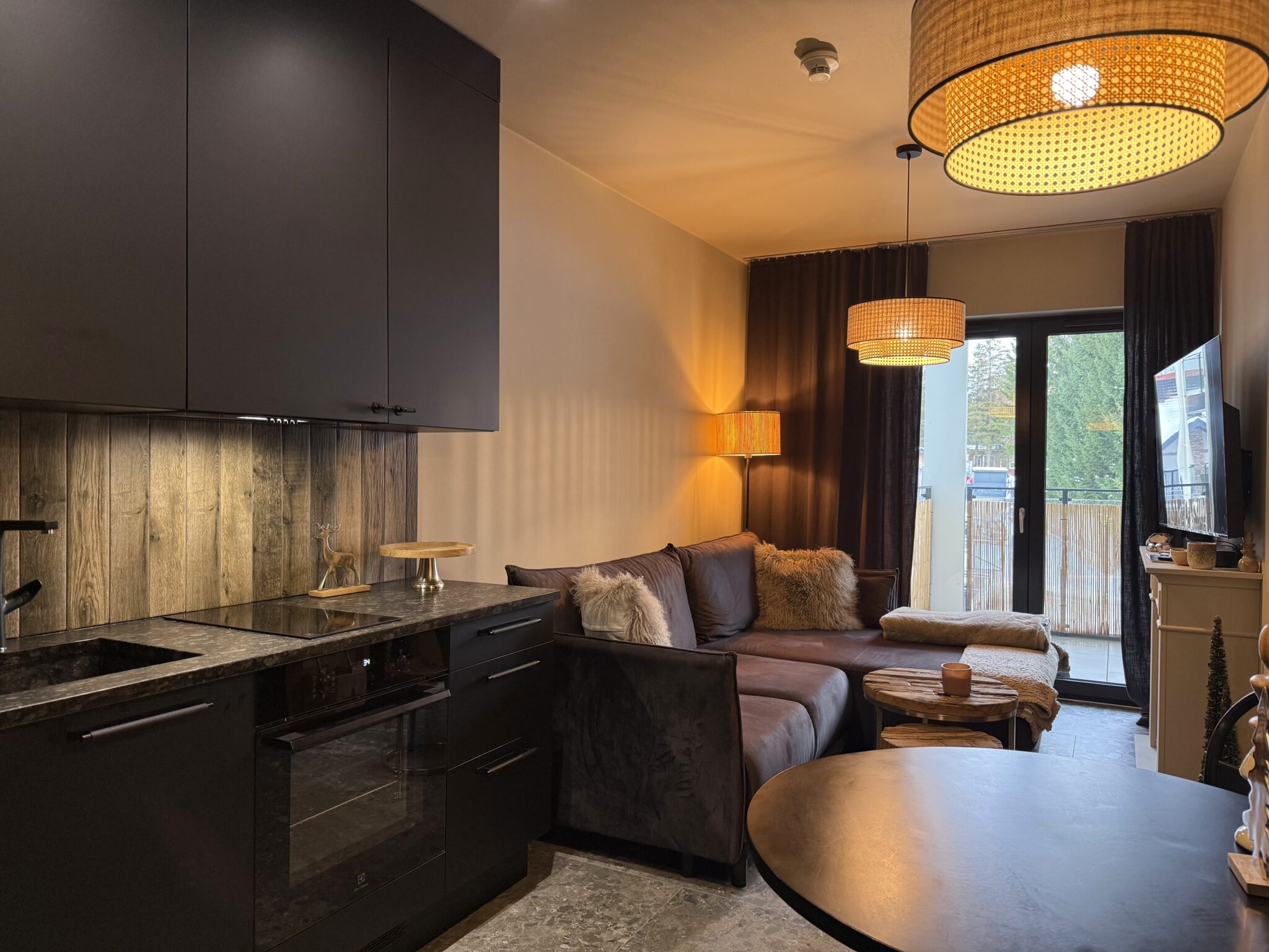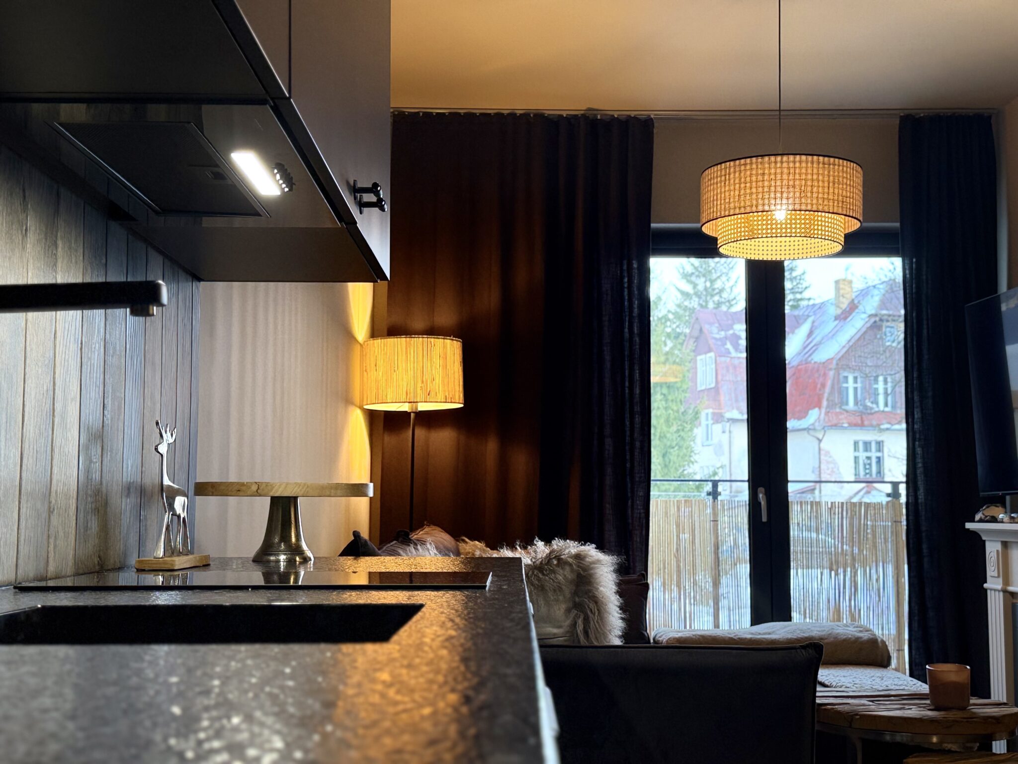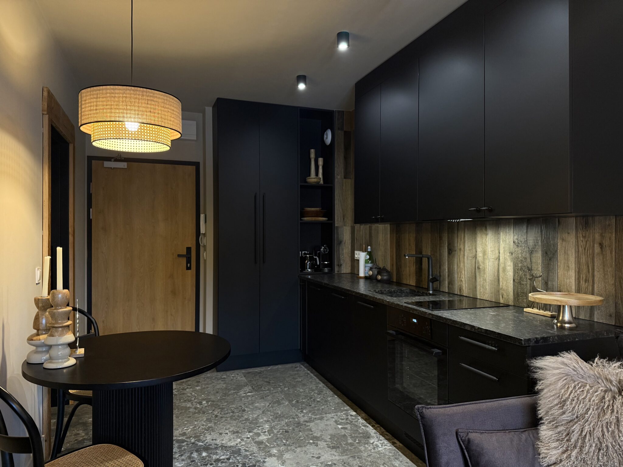 Wnętrze wykończone zostało w wysokim standardzie, z wykorzystaniem naturalnego drewna i kamienia, co nadaje apartamentowi ponadczasowy, elegancki charakter. Kuchnia została wykonana na wymiar przez stolarza, co podkreśla dbałość o detale oraz jakość zabudowy.