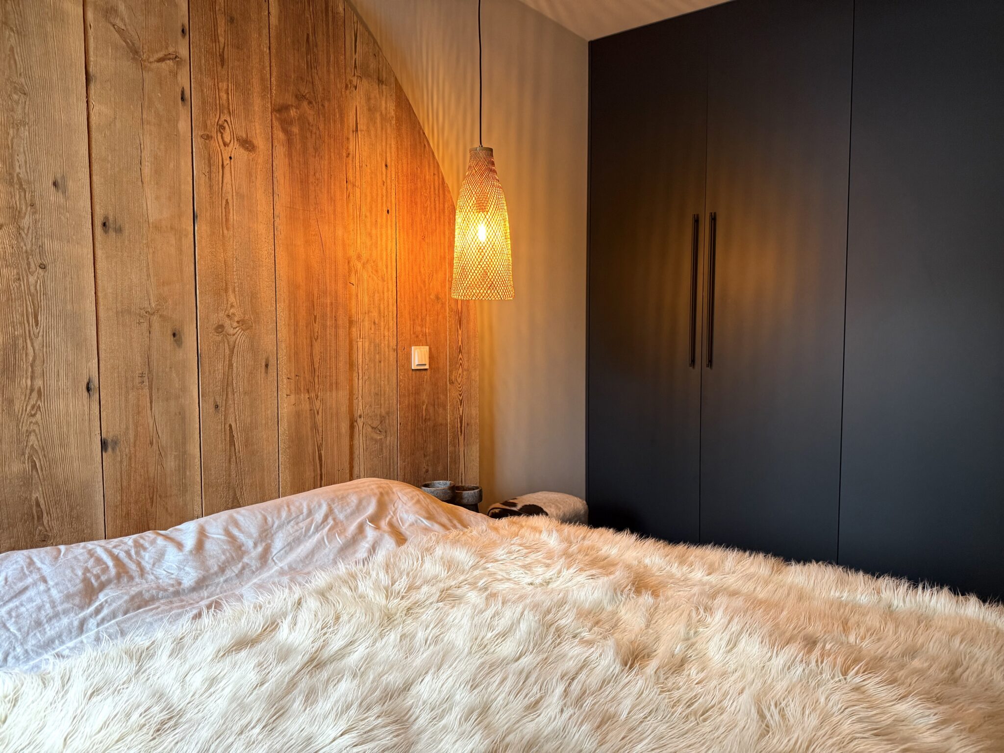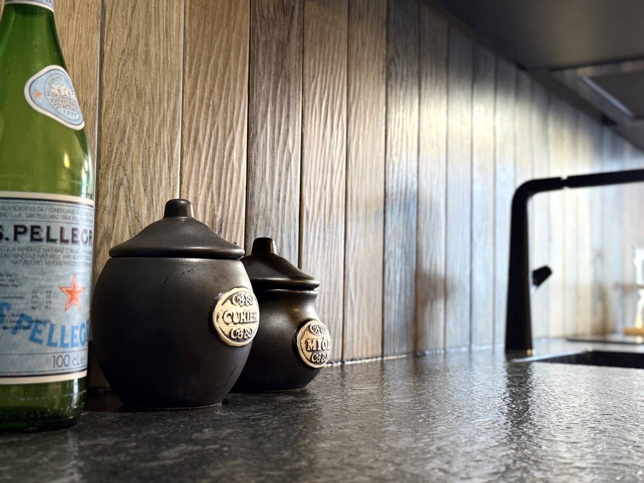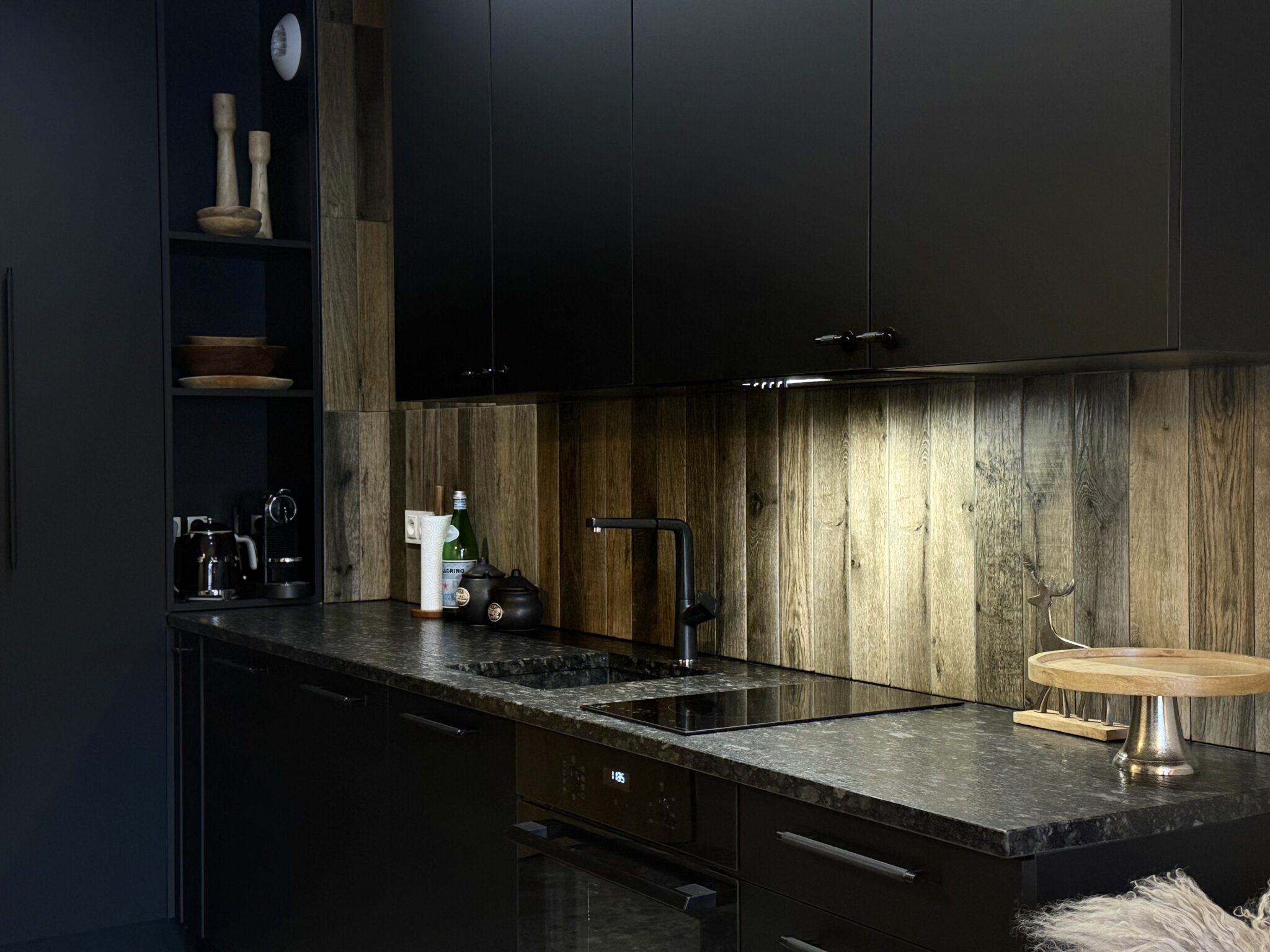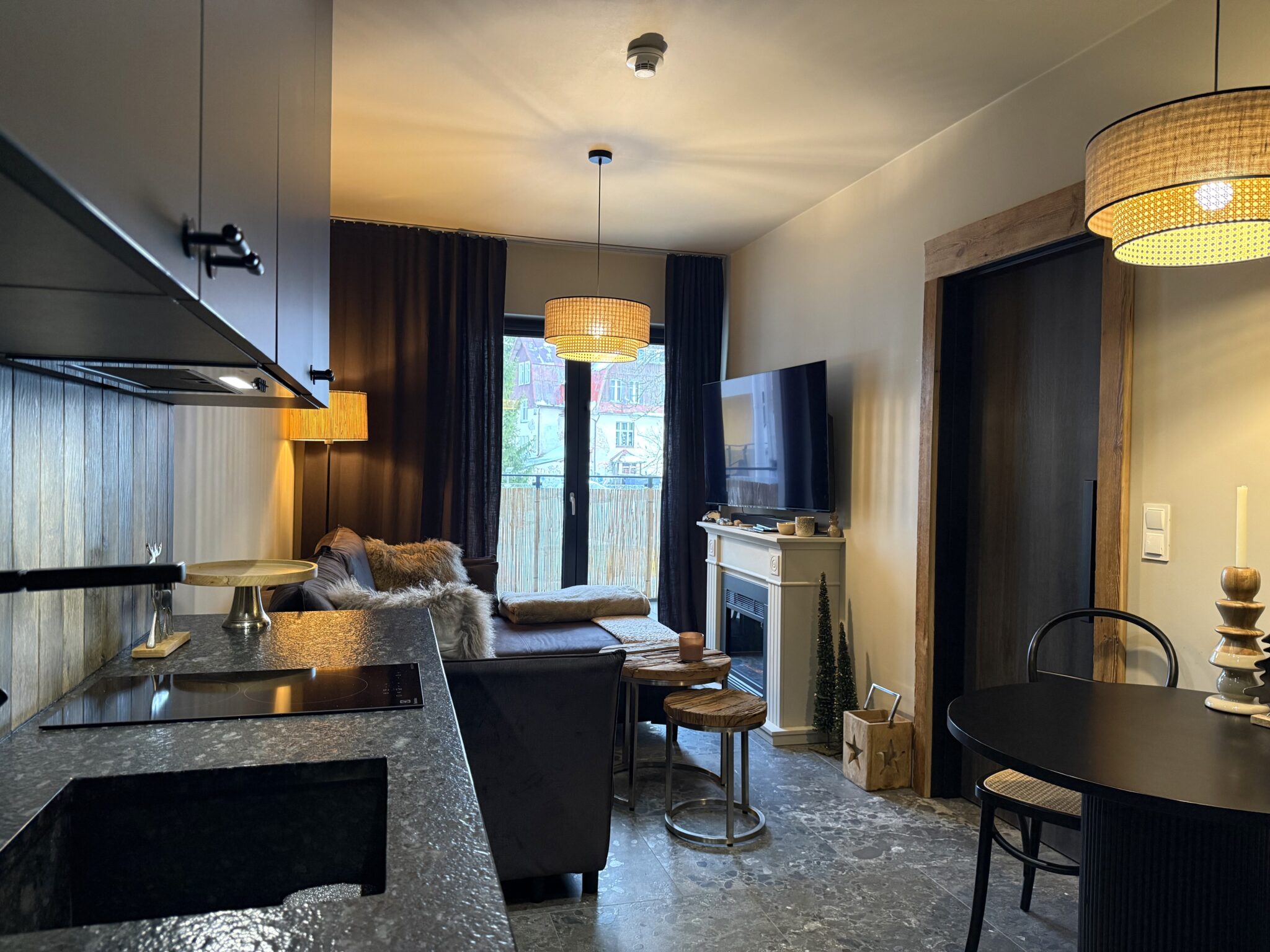 Wnętrze wykończone zostało w wysokim standardzie, z wykorzystaniem naturalnego drewna i kamienia, co nadaje apartamentowi ponadczasowy, elegancki charakter. Kuchnia została wykonana na wymiar przez stolarza, co podkreśla dbałość o detale oraz jakość zabudowy.