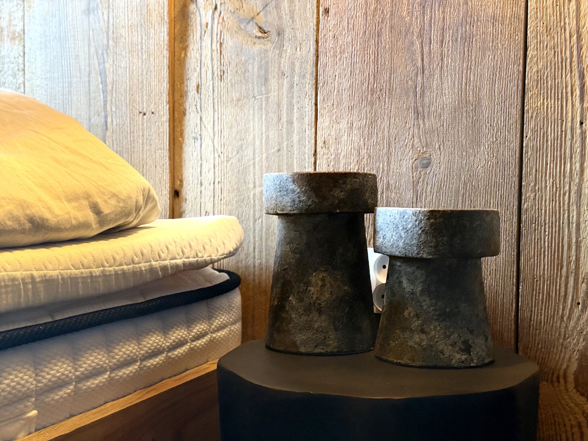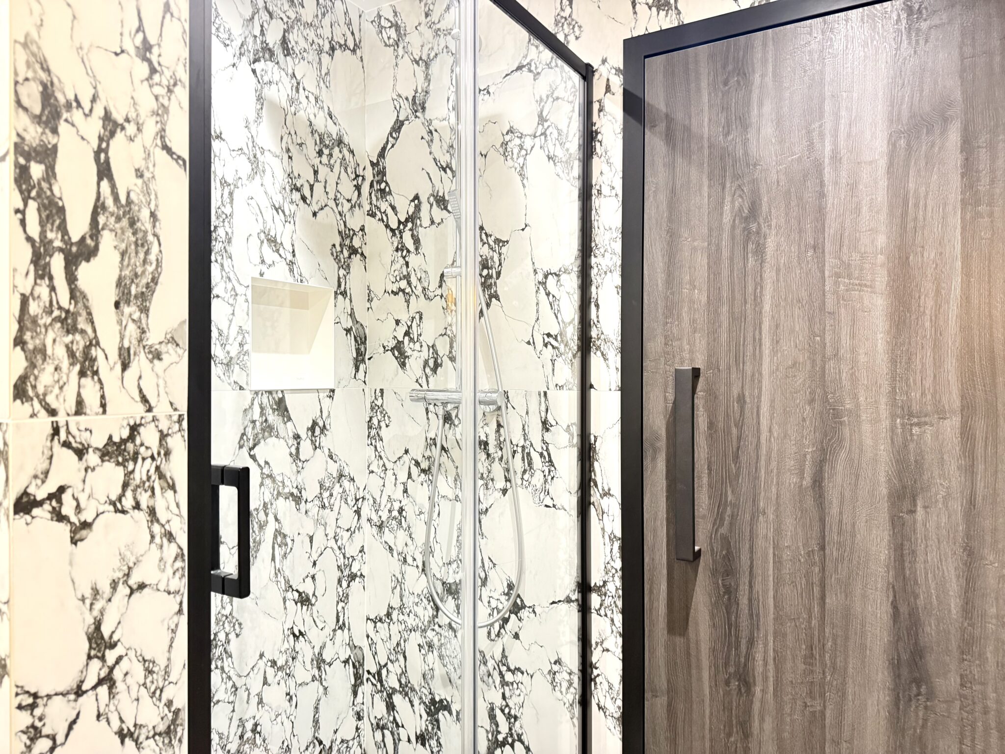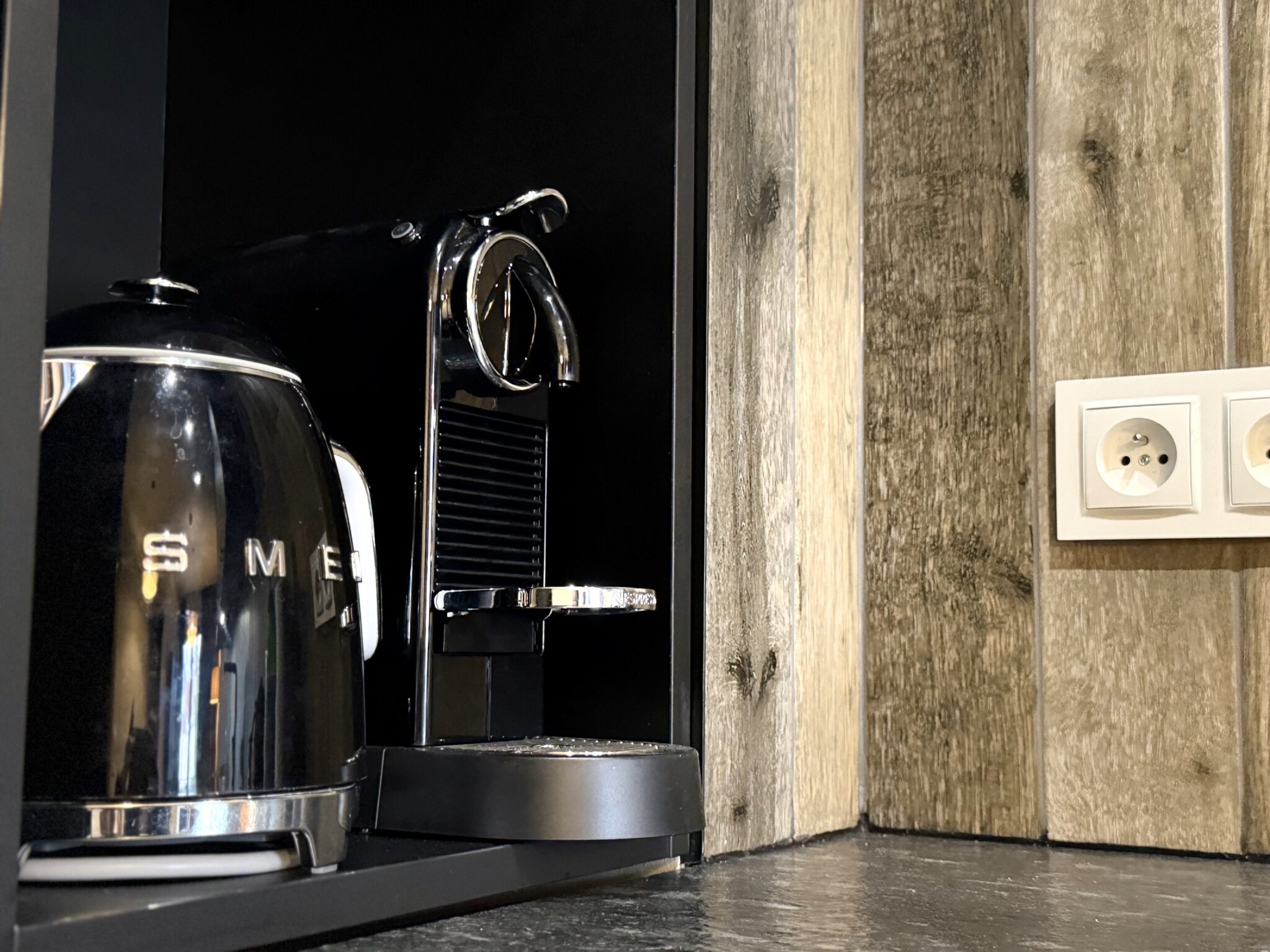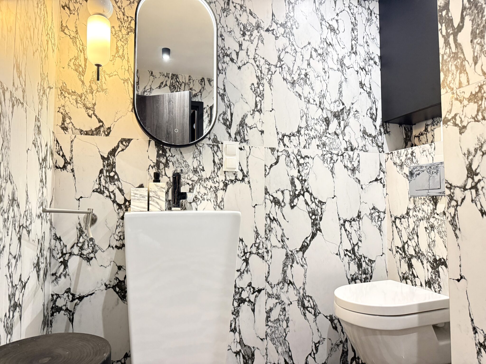 Wnętrze wykończone zostało w wysokim standardzie, z wykorzystaniem naturalnego drewna i kamienia, co nadaje apartamentowi ponadczasowy, elegancki charakter. Kuchnia została wykonana na wymiar przez stolarza, co podkreśla dbałość o detale oraz jakość zabudowy.