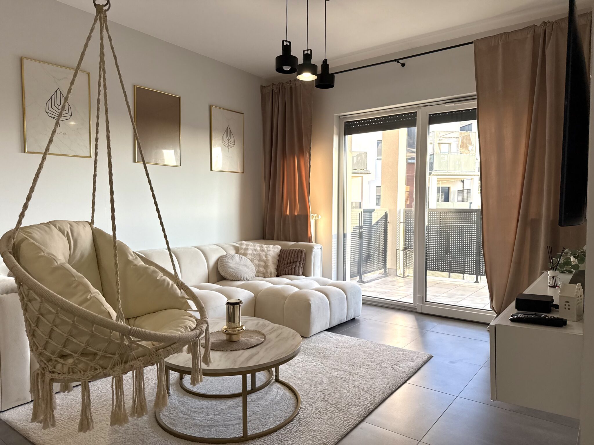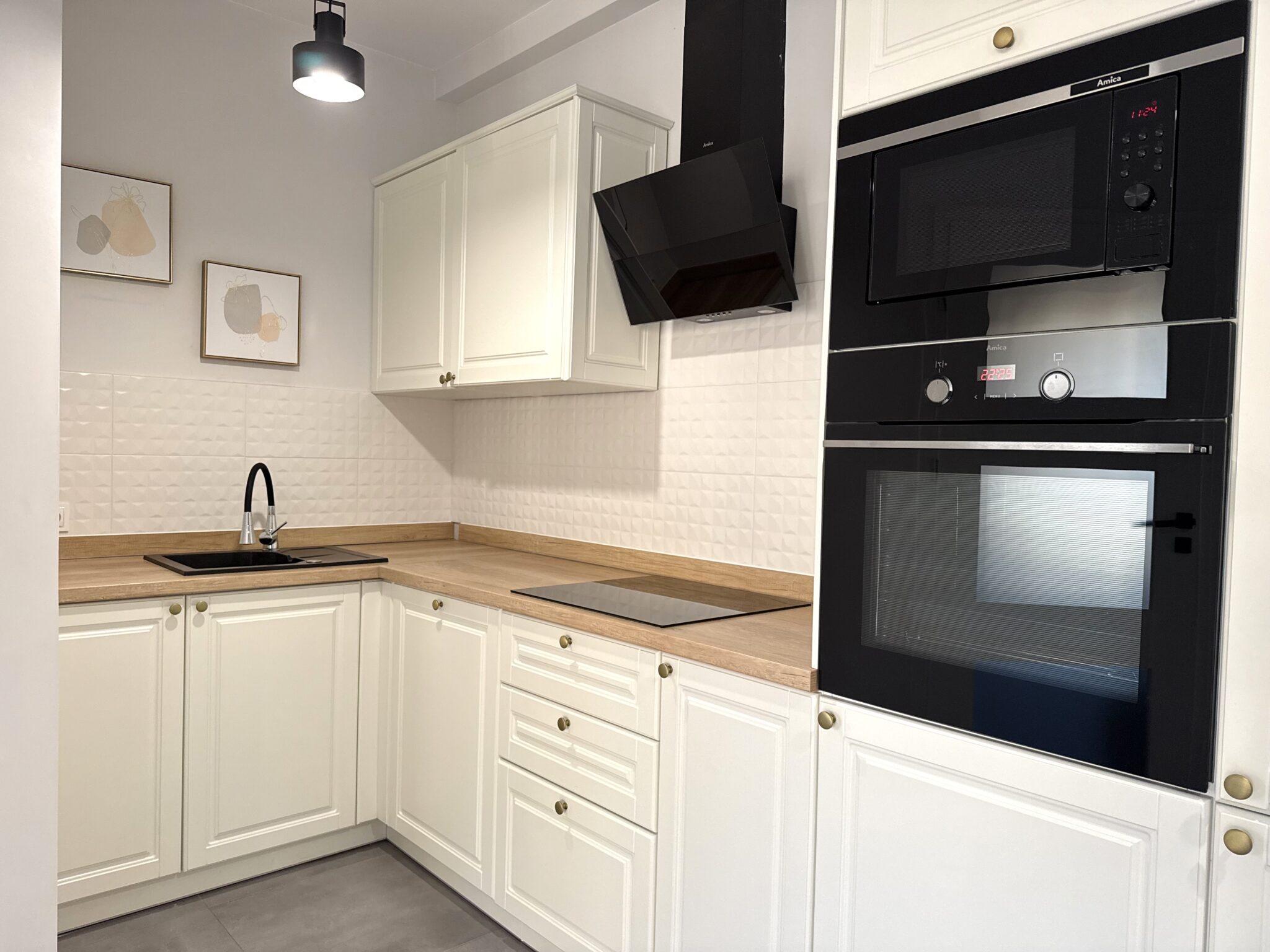 Wnętrze zostało urządzone z dbałością o detale, w jasnej, eleganckiej kolorystyce, tworzącej harmonijną i ponadczasową przestrzeń.