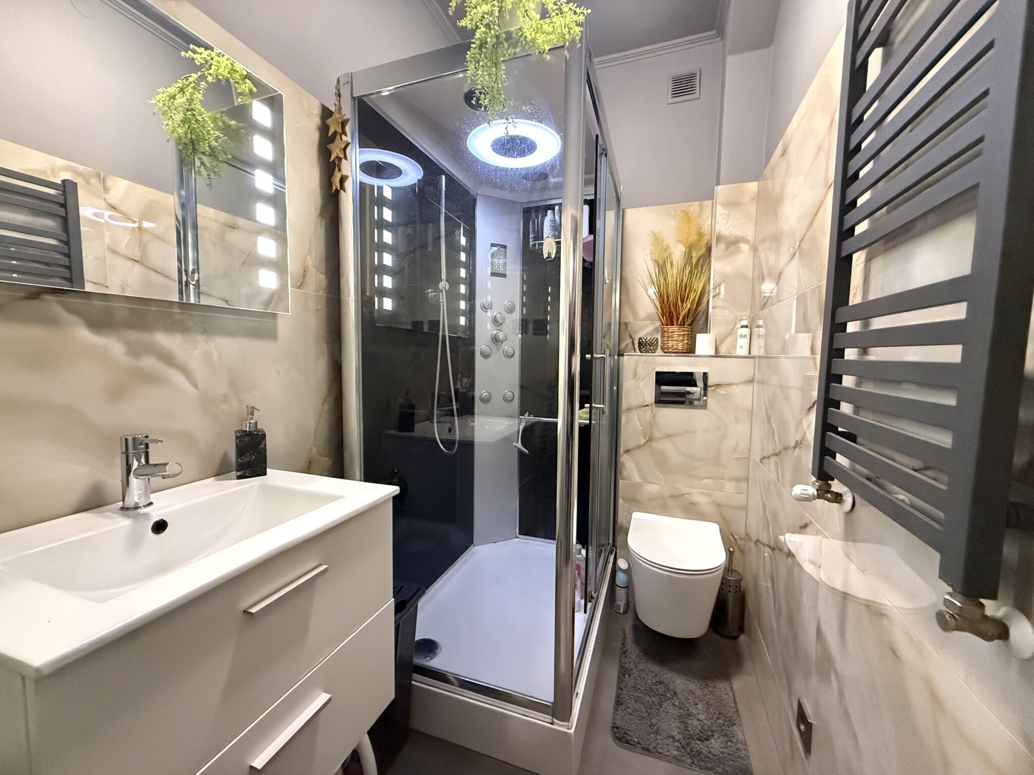 Łazienka funkcjonalnie zaaranżowana, wyposażona w kabinę prysznicową.
