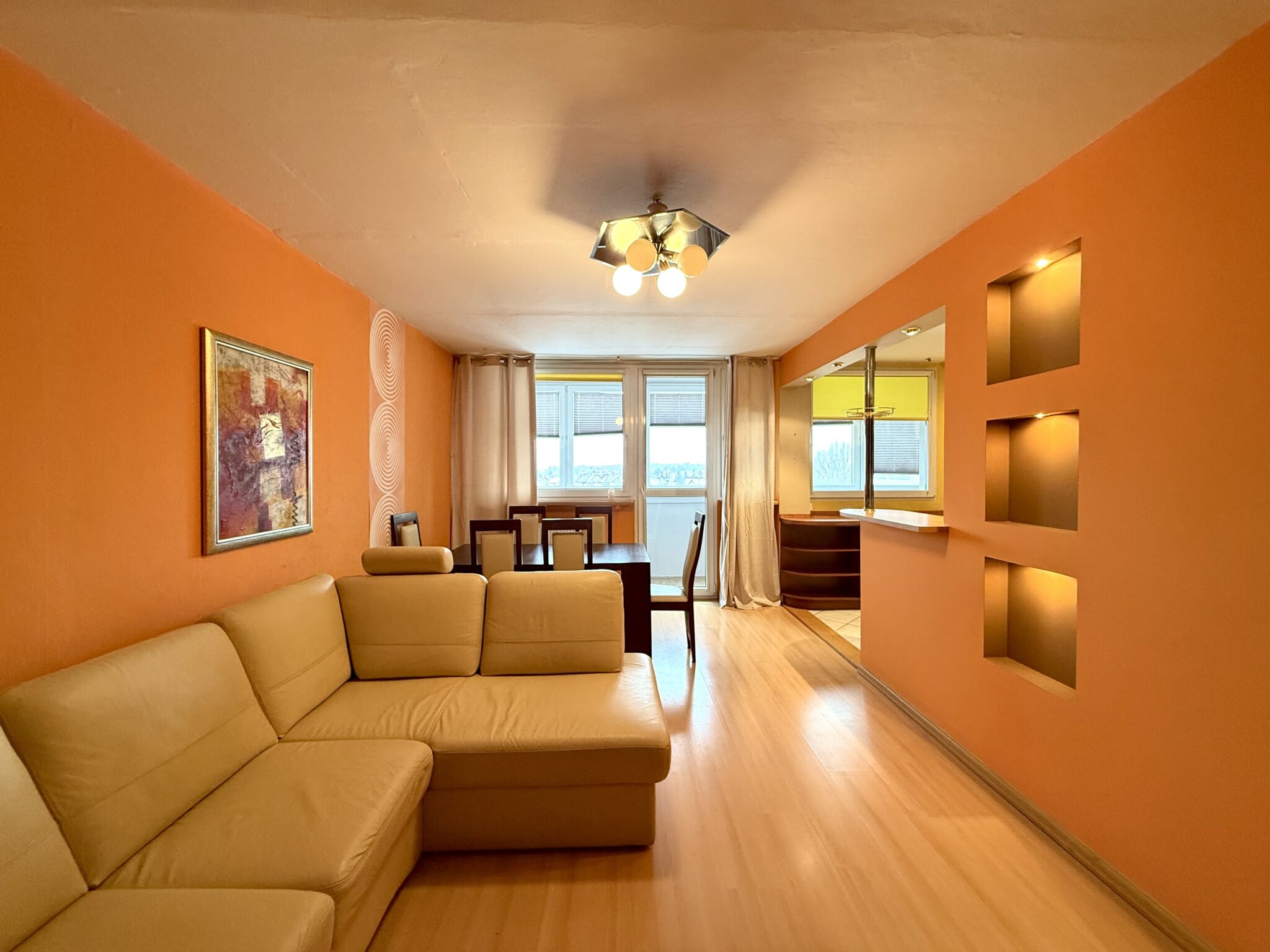Sercem mieszkania jest jasna, otwarta strefa dzienna. Salon z aneksem kuchennym tworzy funkcjonalną przestrzeń łączącą część wypoczynkową i jadalnianą. Duże okna zapewniają bardzo dobre doświetlenie wnętrza przez większą część dnia, a zabudowany balkon zwiększa komfort użytkowania mieszkania przez cały rok.