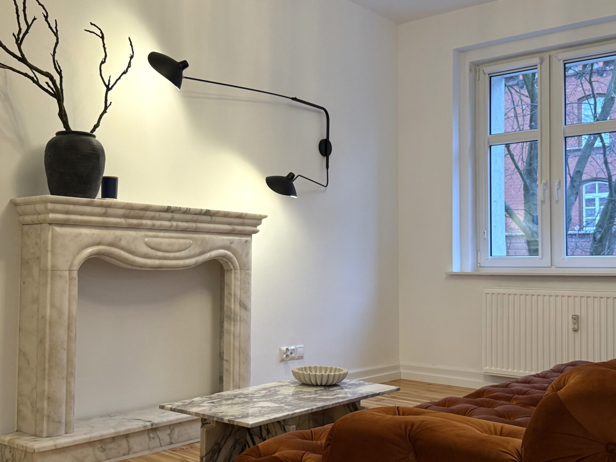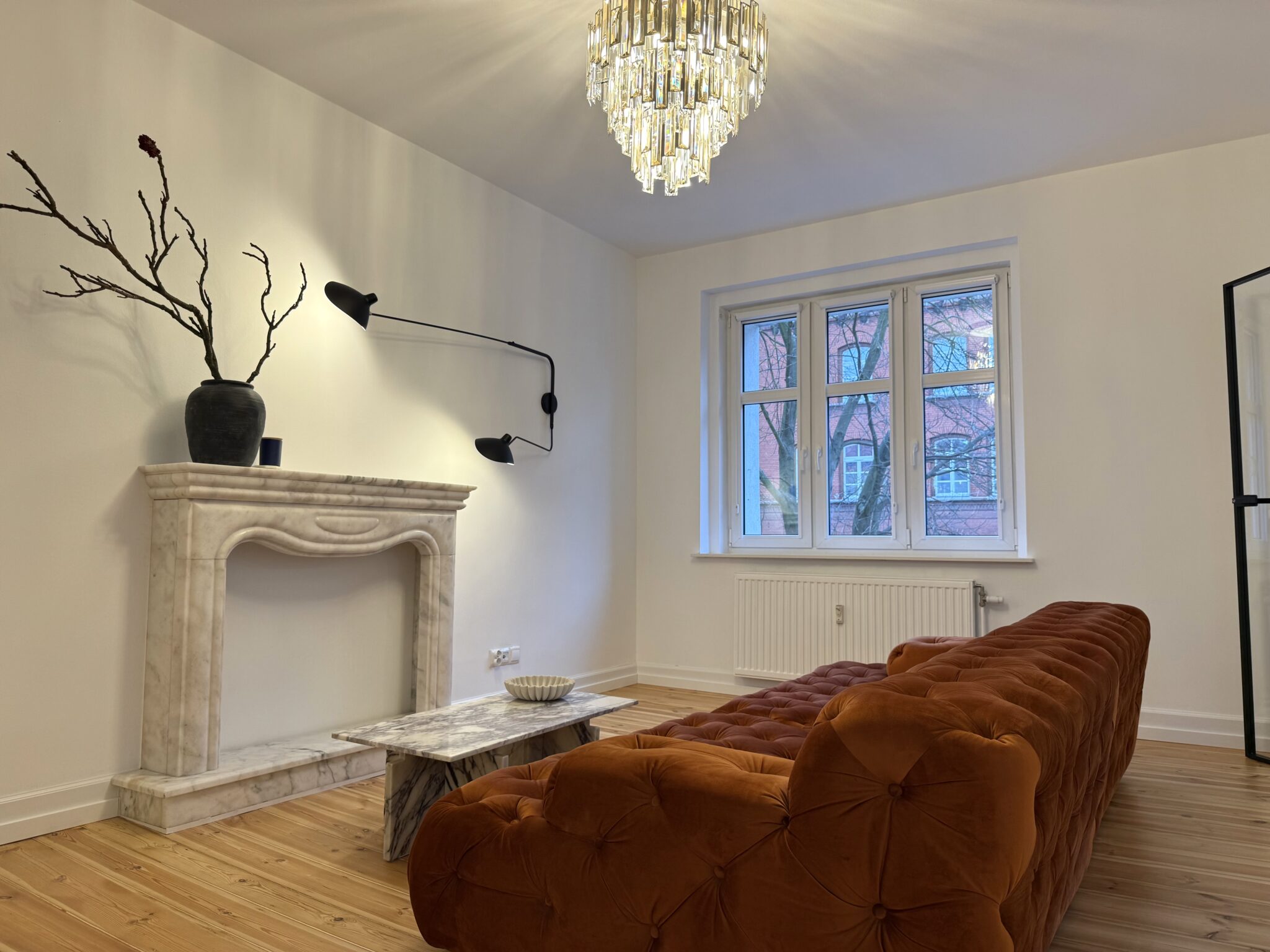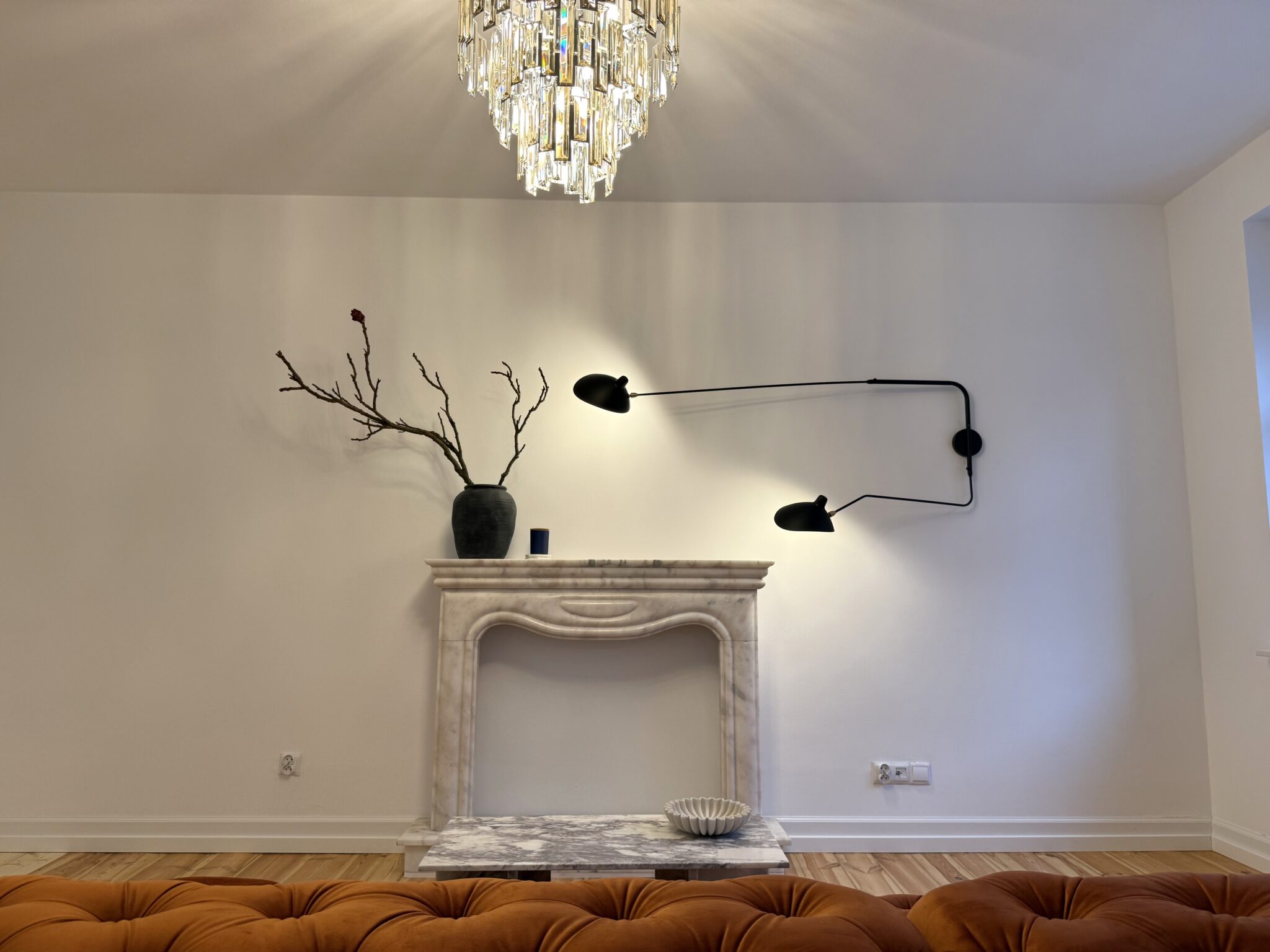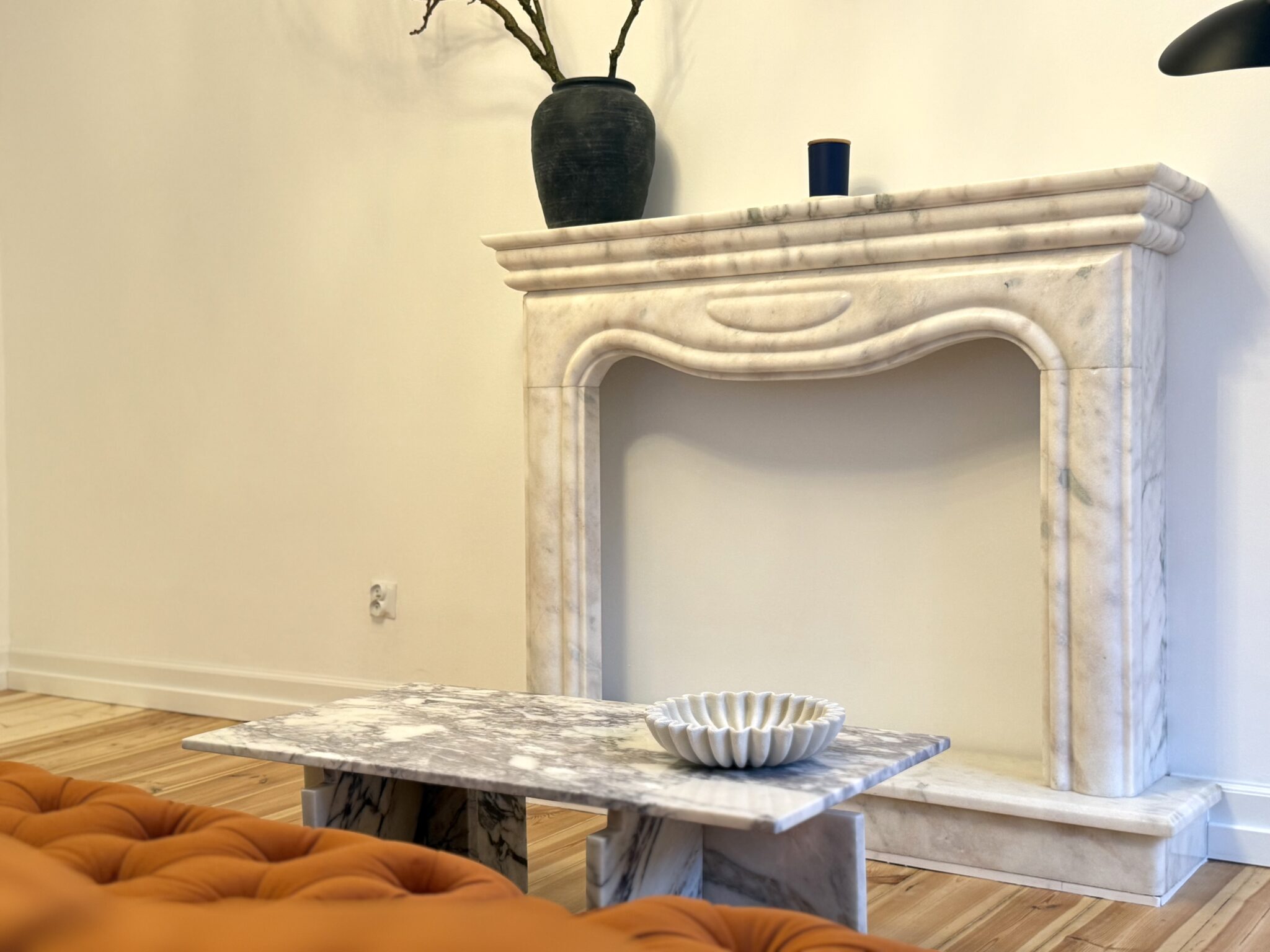 W salonie uwagę przyciąga marmurowy kominek, zdobna lampa Viviana oraz nowa, designerska sofa w odcieniu rudości, która nadaje całemu wnętrzu charakteru.