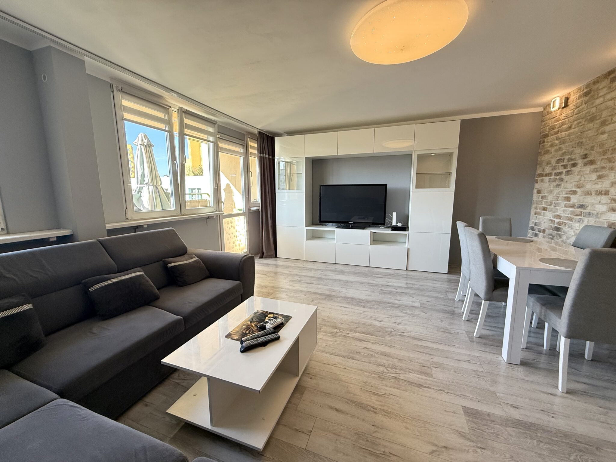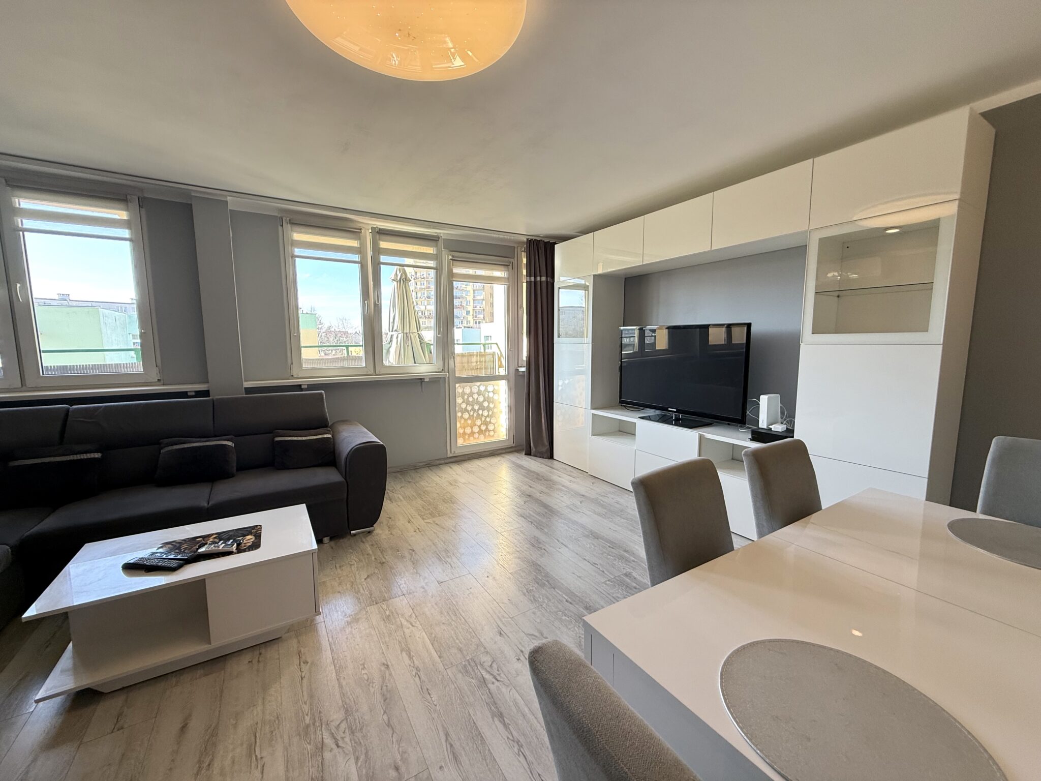 - przestronny, słoneczny salon z wyraźnie wydzieloną strefą wypoczynkową i jadalnianą