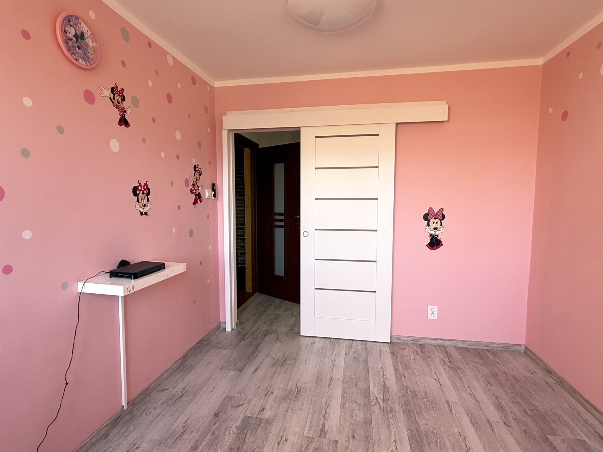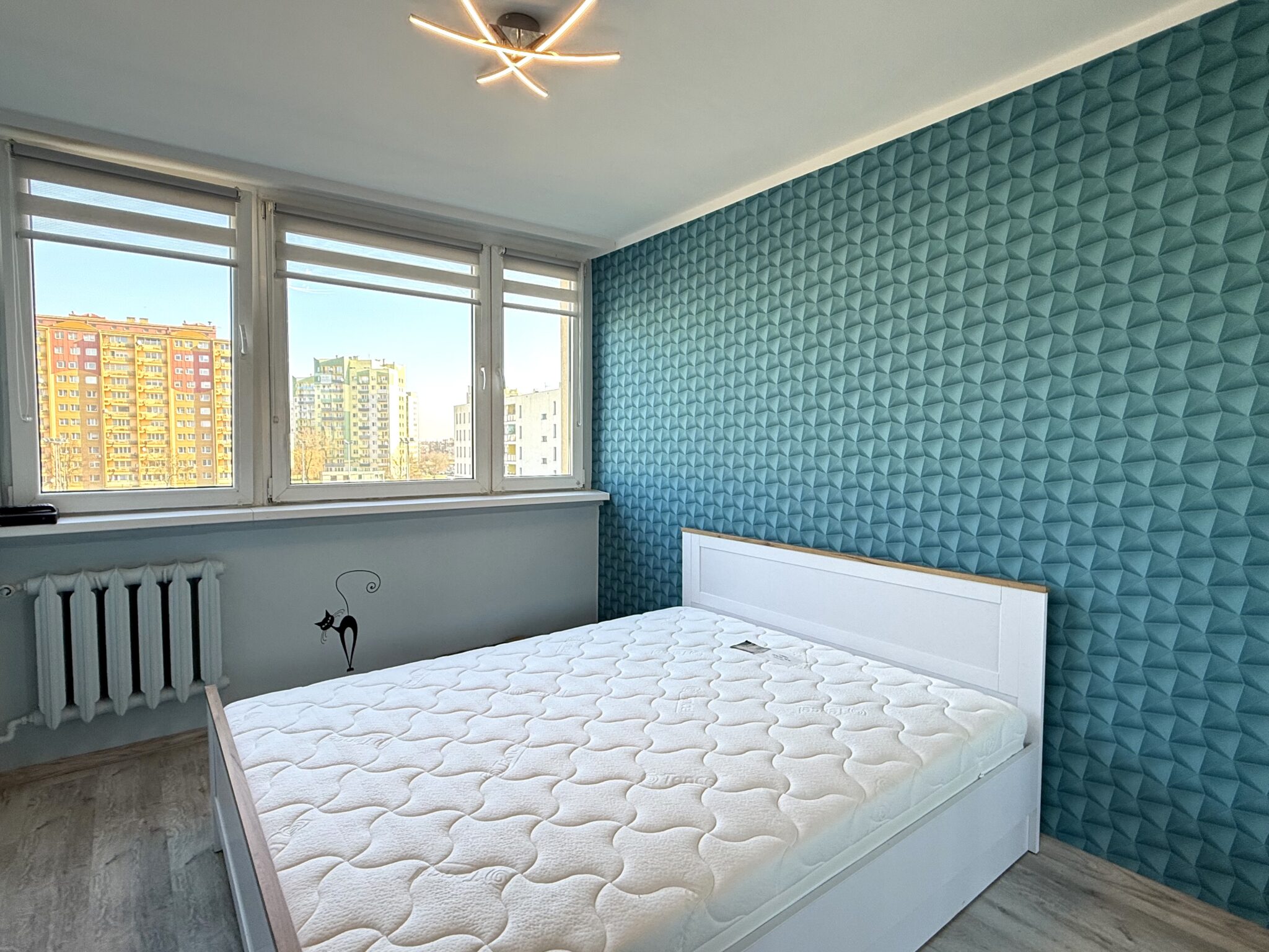 - Sypialnia główna – wyposażona w szafę przesuwną oraz nowe, nieużywane łóżko 160×200 z materacem i szafką nocną